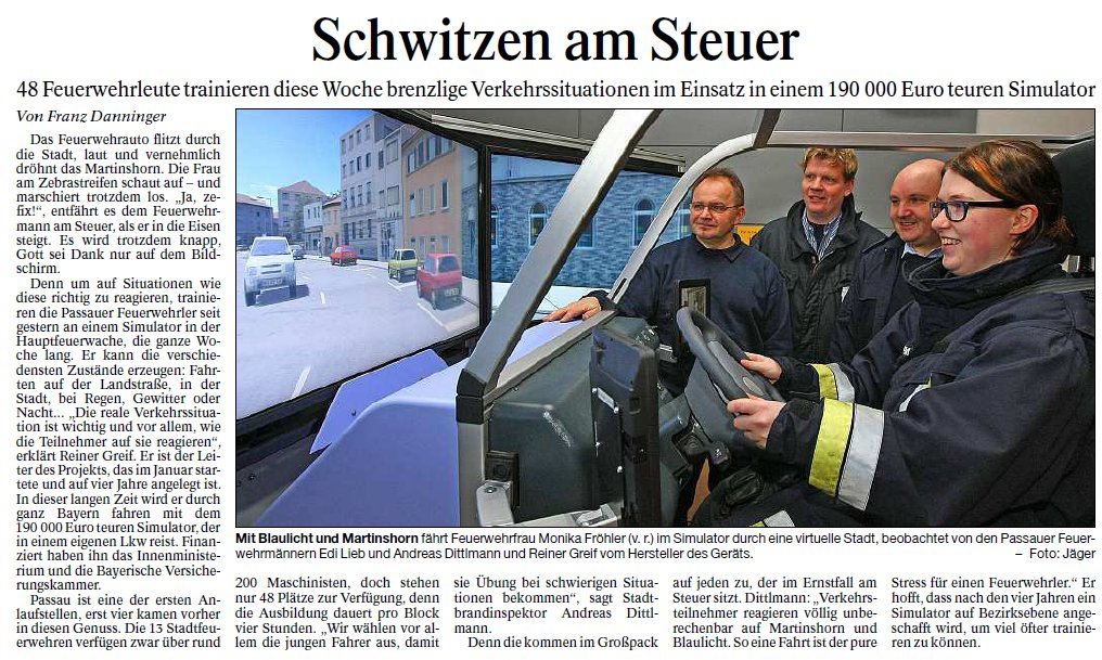 Sicher und in der gebotenen Eile muss der Fahrer Mannschaft und Gerät beim Einsatz an den Einsatzort bringen. Trotz Sonderrechten im Verkehr darf er andere Verkehrsteilnehmer nicht nötigen und/oder sich durch deren Verhalten provozieren lassen. Der Fahrer muss sich wie alle anderen Einsatzkräfte an die Anweisungen des Einsatzleiters halten, allerdings ist er allein für das Führen des Fahrzeuges verantwortlich. Geübt werden können solche Einsatzfahrten am Fahrsimulator und speziellen Fahrertrainigs. Regelmässige Übungs- und Bewegungsfahrten unternehmen wir besonders mit unseren jüngeren Fahrern um sie mit dem Fahrverhalten und den doch größeren Abmassen unseres TSF-W vertraut zu machen. Nach einer entsprechenden Einweisung darf unser TSF-W auch mit dem Führerschein Klasse B gefahren werden, seit 2013 gibt es die Möglichkeit den "Feuerwehr-Führerschein" zu erwerben.
